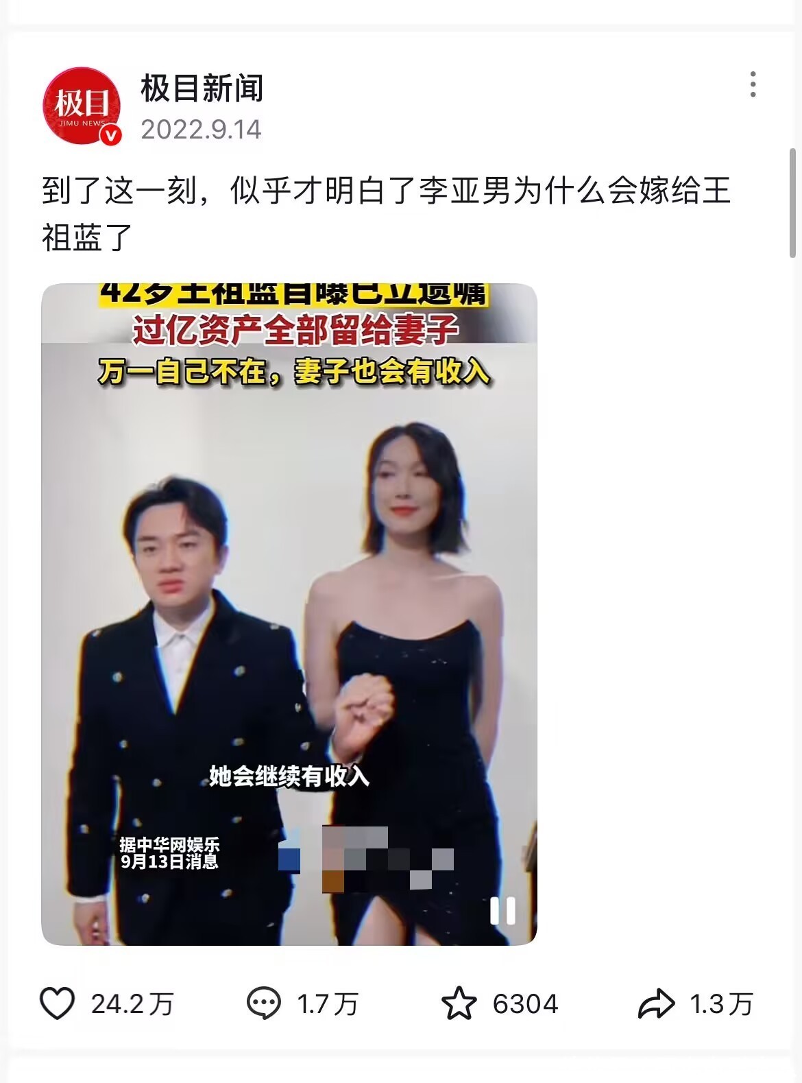 王祖蓝同样早早立下遗嘱,把上亿财产留给太太李亚男。